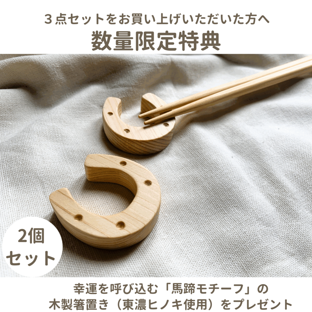 数量限定特典として、東濃ヒノキで作った「馬蹄モチーフの箸置き」
